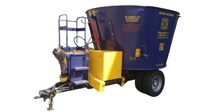 Кормораздатчик-измельчитель-смеситель с транспортерной лентой на одноосном шасси и объемом бункера 9 м3